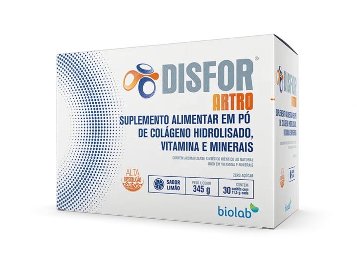 Disfor Artro contains hydrolyzed collagen and a combination of vitamins and minerals that help maintain connective tissues (cartilage).