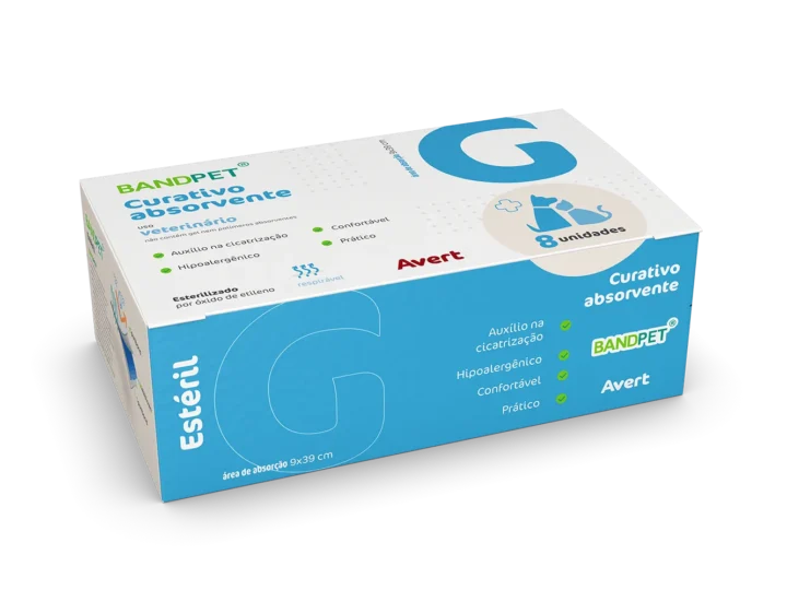 BANDPET® ESTÉRIL G é um curativo absorvente de uso veterinário formado por três camadas que auxiliam no processo de cicatrização, além de proporcionar proteção mecânica e formar uma barreira que impede a contaminação da região lesionada. O produto não contém gel nem polímeros absorventes e é esterilizado por óxido de etileno. Indicado para auxiliar no manejo de feridas em cães e gatos de qualquer idade.