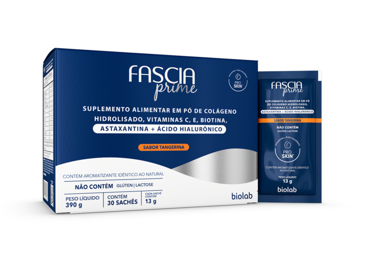 Fascia® Prime é um suplemento alimentar com sabor tangerina desenvolvido exclusivamente para auxiliar na manutenção da pele e na proteção dos danos causados pelos radicais livres , como exposição ao sol, estresse e poluição. Fascia® Prime Colágeno hidrolisado associado ao exclusivo Complexo ProSkin®, que une astaxantina e ácido hialurônico, além das vitaminas C, E e biotina, fornecendo uma composição adequada para saúde da pele. Fascia® Prime é livre de lactose e glúten.