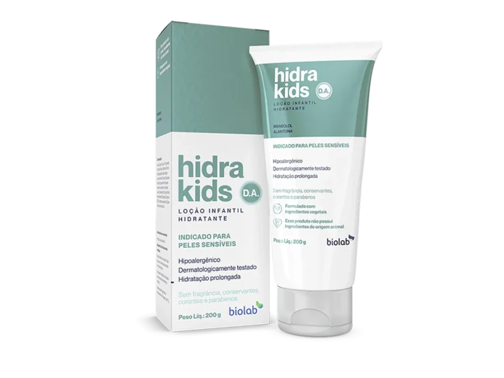 Com bisabolol e alantoína, HIDRAKIDS D.A Loção Infantil hidratante e suavizante para peles sensíveis é uma loção corporal desenvolvida especialmente para a pele delicada de bebês e crianças, atuando inclusive na prevenção de assaduras. Auxiliam na manutenção da hidratação da pele, protegendo-a contra ressecamentos. Este produto foi formulado de maneira a minimizar possível surgimento de alergia.
